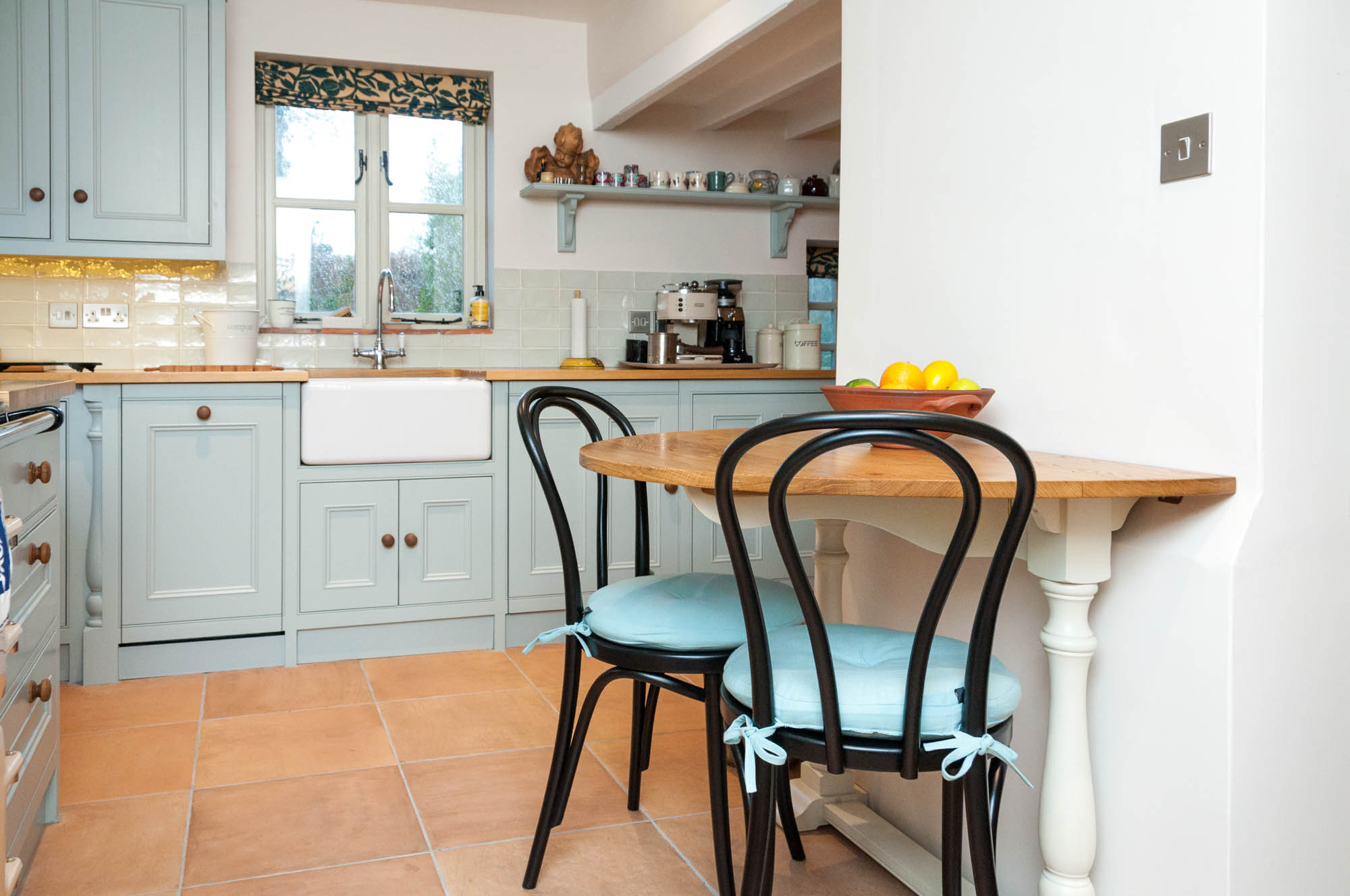 A chimney canopy site over the oil-fired range. The splashback tiles are the cilent’s own from Fired Earth. The cabinets are painted in Farrow and Ball Light Blue, and a natural oak plank worksurface creates a warm, welcoming and practical workspace.